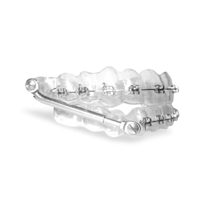 Both the upper and lower arches are fitted with transparent, BPA-free thermoplastic shells (similar to aligners), custom-made to match your dental impression for a secure and comfortable fit. - Orthodontic Brackets: