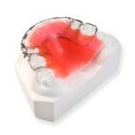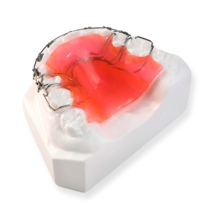 Made from a transparent or colored acrylic plate that fits snugly against the roof of the mouth, with stainless steel wire components for a secure fit. - Brackets on Archwire: